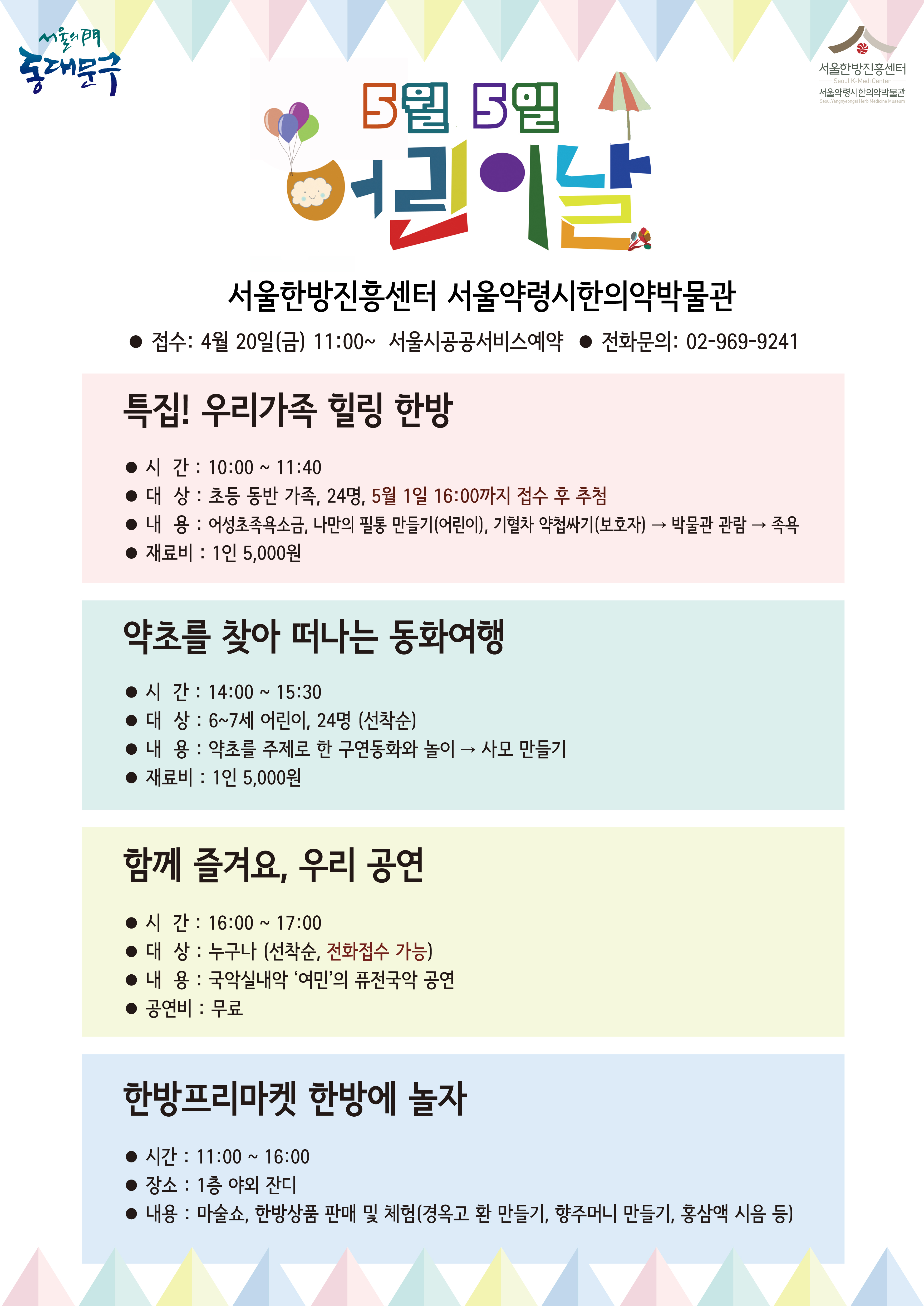 ¡®Æ¯Áý ¿ì¸®°¡Á· Èú¸µ Çѹ桯, ¡®¾àÃʸ¦ ã¾Æ ¶°³ª´Â µ¿È­¿©Ç࡯ Âü°¡ºñ´Â 1ÀÎ 5,000¿øÀ̸ç, ¼­¿ï½Ã °ø°ø¼­ºñ½º ¿¹¾à »çÀÌÆ®¸¦ ÅëÇØ Âü¿©ÇÒ ¼ö ÀÖ´Ù. ½Åû ¹× Á¢¼ö µî ÀÚ¼¼ÇÑ »çÇ×Àº ¼­¿ïÇѹæÁøÈï¼¾ÅÍ·Î ¹®ÀÇÇÏ¸é ¾È³» ¹ÞÀ» ¼ö ÀÖ´Ù.