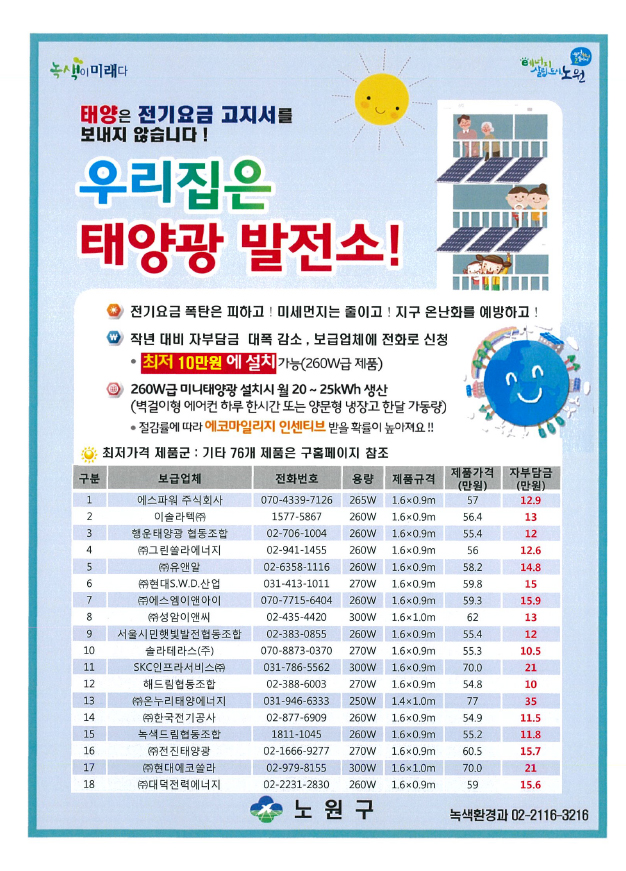 ÃÖ¿ë±Ù ±âÀÚ/ ¼­¿ï ³ë¿ø±¸°¡ ¾ÆÆÄÆ® º£¶õ´Ù µîÀ» Ȱ¿ëÇÑ ¡®¹Ì´Ï ž籤 ¼³Ä¡¡¯¿¡ ´ëÇÑ º¸Á¶±Ý Áö¿øÀ» °­È­Çϱâ·Î ÇÏ°í ½ÅûÀÚ¸¦ ¸ðÁýÇÑ´Ù.